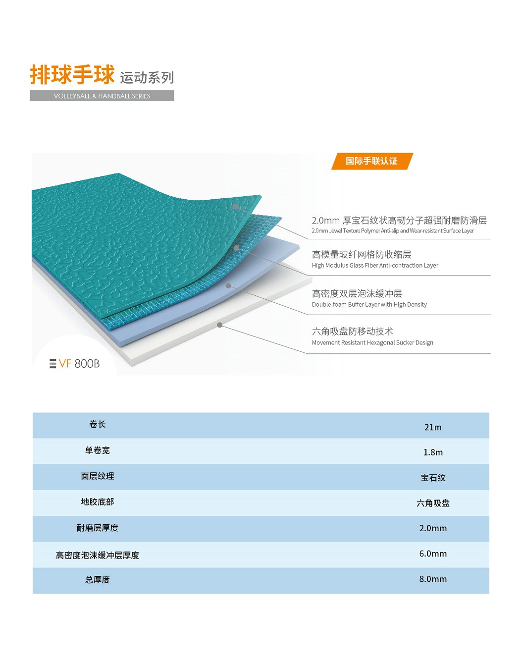 天速排球手球运动系列地胶VF 800B湖水蓝